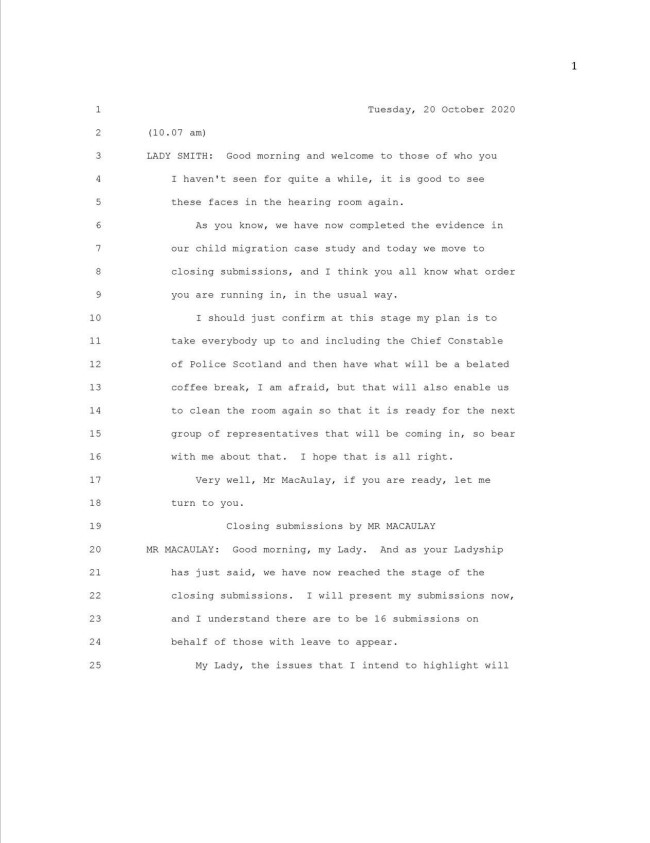 Closing submissions by Mr MacAulay, Mr Scott (on behalf of INCAS), Mr Gale (on behalf of FBGA), Ms Lawrie (on behalf of the Lord Advocate), Ms van der Westhuizen (on behalf of the Chief Constable of Police Scotland), Mr Watson (on behalf of the Christian Brothers), Mr Watson (on behalf of Barnardo's), Mr Henry (on behalf of the Good Shepherd Sisters), Mr Henry (on behalf of the Bishops Conference of Scotland), Mr Lindsay (on behalf of the Sisters of Nazareth), Ms Mitchell (on behalf of Quarriers), Mr McGillivray (on behalf of the Royal Over-Seas League).